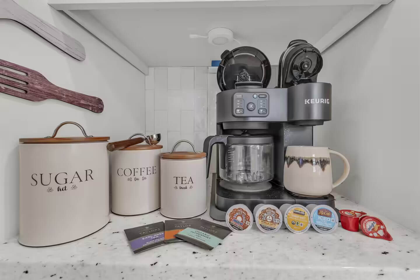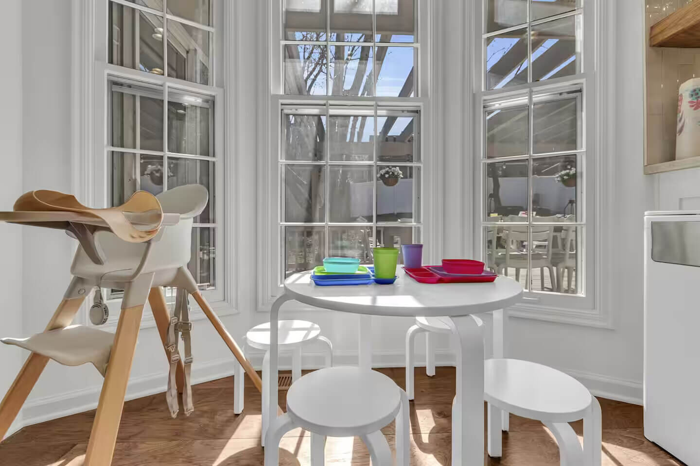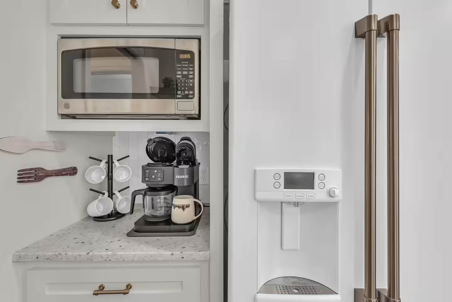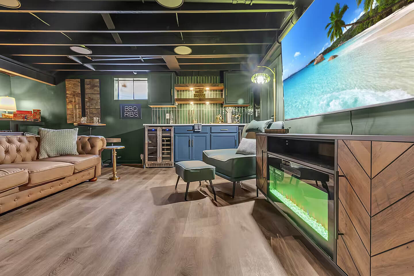The modern chef’s kitchen is fully equipped with elegant cabinetry, modern GE Café appliances, and a spacious island with seating for 4, ideal for meal prep, family dinners, or casual bites. For our younger guests, there’s a kids’ table with 4 chairs and a Stokke high chair for added comfort. Start your day off right with the well-stocked coffee and tea station, featuring everything you need to brew your perfect cup. Whether you’re preparing a gourmet meal or enjoying a morning coffee, this kitchen has everything you need.