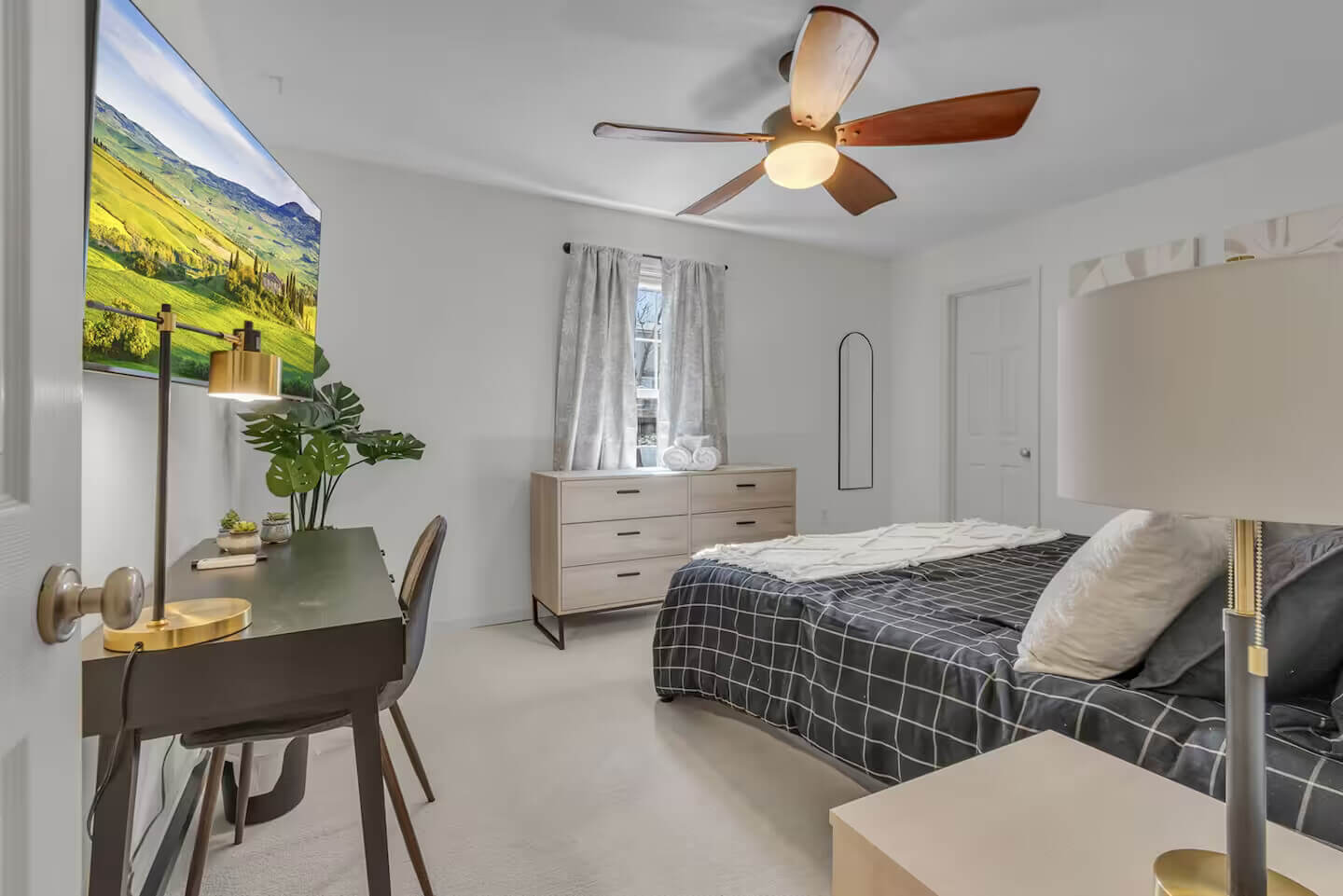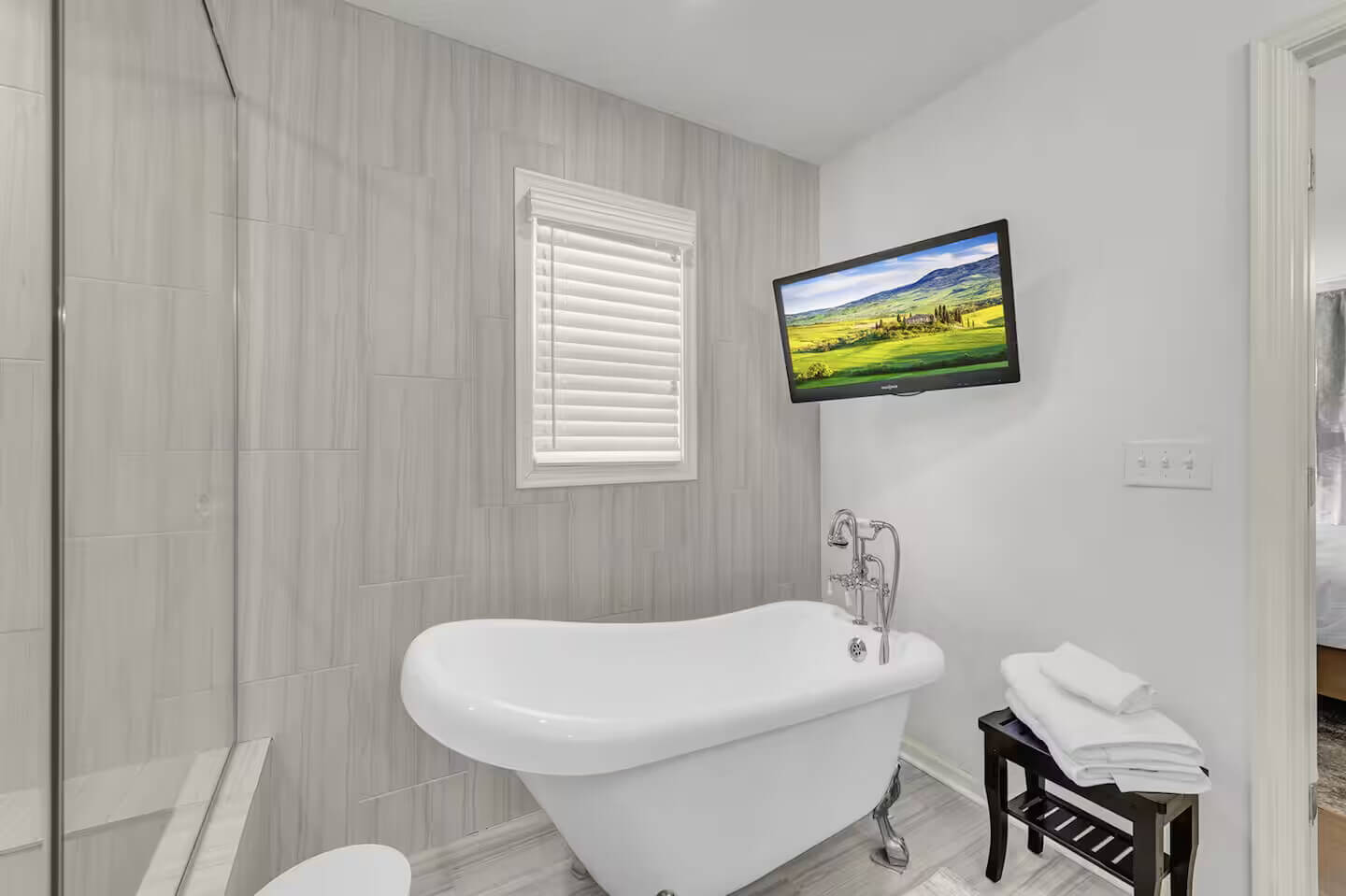 Main-Level Master Bedroom: Enjoy privacy and comfort in the spacious king-sized bed, with an en-suite full bathroom featuring a clawfoot tub, walk-in shower, and double vanities – perfect for unwinding after a busy day.